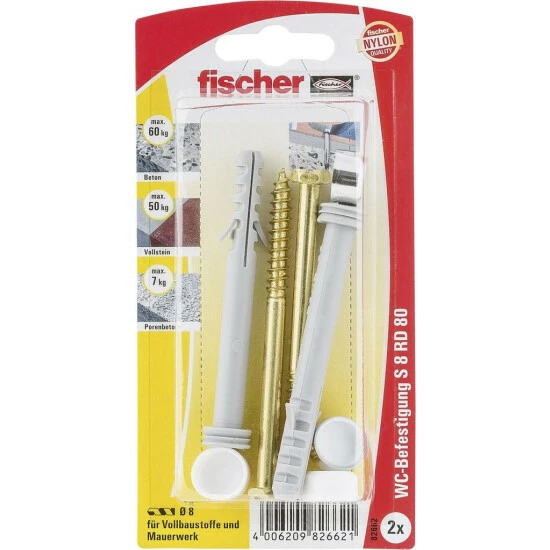 Das Fischer Befestigungsset WC S 8 RD 80 K beinhaltet alle Elemente zur sicheren Befestigung von Stand-WCs: 2 Fischer Spreizdübel 8 RD 60 aus hochwertigem Nylon, 2 Messing-Holzschrauben 6 x 85 mit Sechskantkopf und jeweils 2 weiße und Chromfarben Abdeckkappen.Inhalt: 8 teiligMaße Dübel: 8 x 60 mmMaße Schrauben: 6,0 x 80 mmMontageart: DurchsteckmontageGeeignet für: Beton, Kalksand-Vollstein, Naturstein mit dichtem Gefüge, Vollstein aus Leichtbeton, Vollziegel
