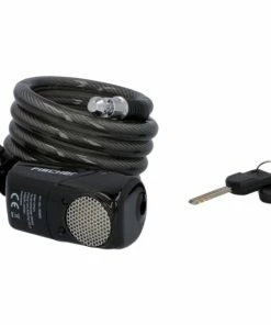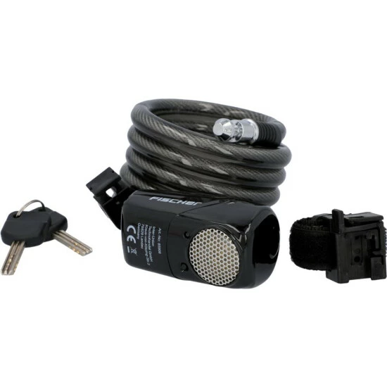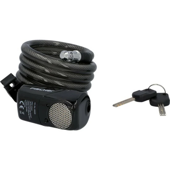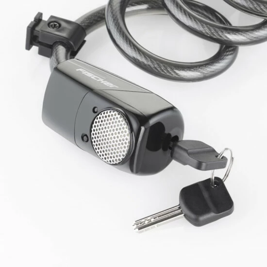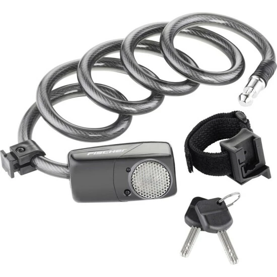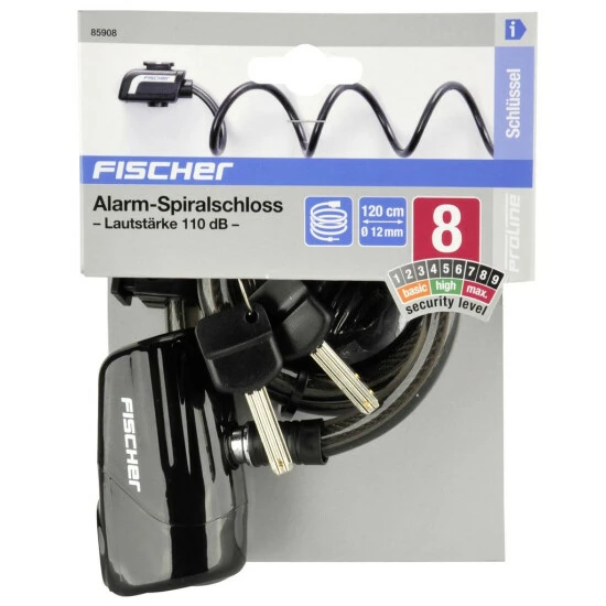 Das Alarm-Spiralschloss von Fischer ist 120cm lang und 12mm dick. Die Lautstärke des Alarms beträgt 110 dB. Ausgelöst wird er bei Durchtrennen des Kabels oder durch Stöße, wenn der Bewebungsmelder aktiivert ist. Er hat eine bequeme Automatikverriegelung und zwei komfortable Wendeschlüssel. Durch die Spiralform ist er besonders platzsparend und leicht zu transportieren. Bei Lieferung sind zwei Schlüssel und Halterung enthalten.
