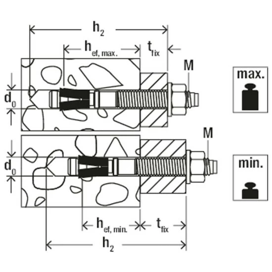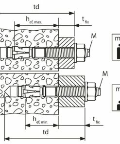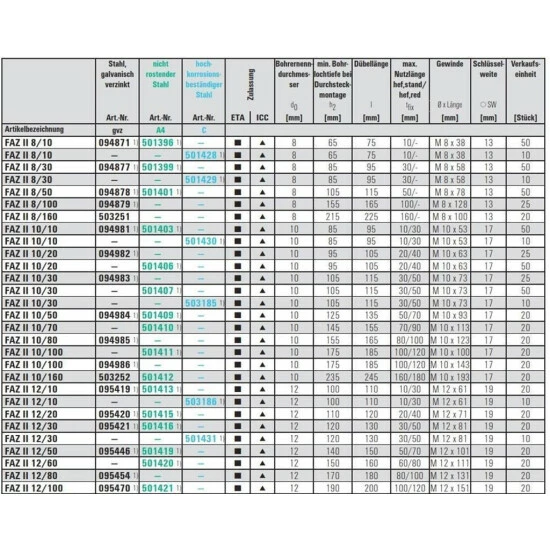 Typ: FAZ 12/30 Mindest Bohrlochtiefe: 120 mm Verankerungstiefe: Min. 70 mm L: 130 mm Nutzlänge: 30 mm