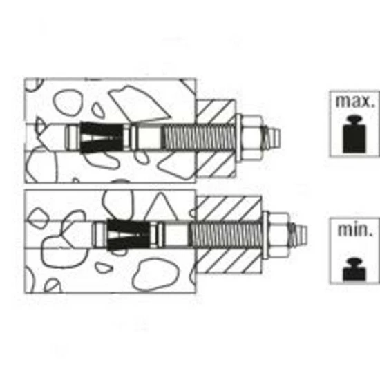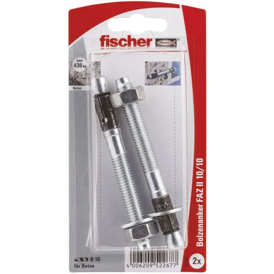 Für die Befestigung von schweren Gegenständen in Beton ist der fischer Bolzenanker FAZ II zu empfehlen. Mit dem bewährten Spreizclip entspricht der Stahldübel höchsten Anforderungen. Der Stahldübel kann einfach montiert werden: Mit dem Hammer einschlagen und dann mit einem Drehmomentschlüssel anziehen – fertig. Der Bolzenanker aus galvanisch verzinktem Stahl ist besonders flexibel einzusetzen, weil sich damit verschiedenste Gegenstände im Innenbereich wie TV-Konsolen, Treppengeländer oder Kabeltrassen befestigen lassen.