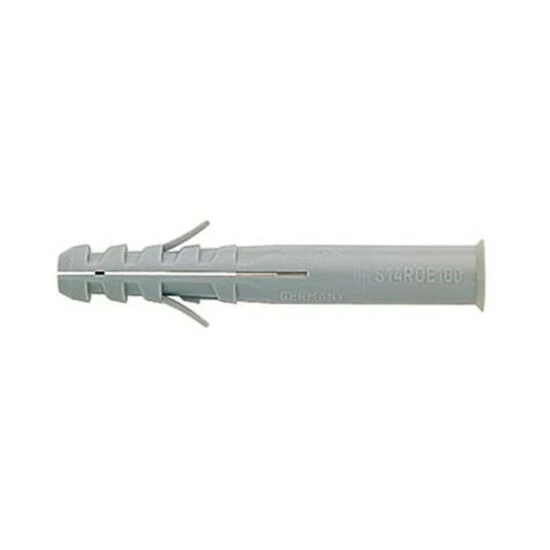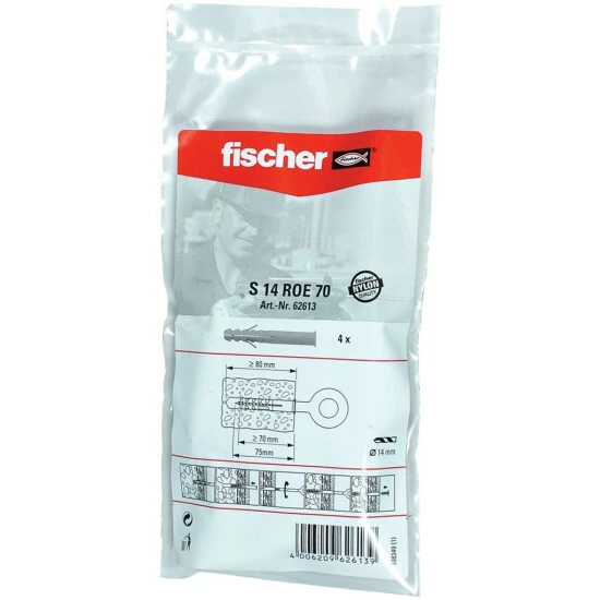 Der Fischer Dübel S 14 ROE ist ein aus hochwertigem Nylon hergestellter Spreizdübel zur Aufnahme der Fischer Gerüstöse GS 12. Die Spreizflügel verhindern ein Mitdrehen und erleichtern die Montage. Beim Eindrehen der Gerüstöse verspreizt die Spreizzone und verankert sicher im Baustoff. Bei Montage in Randnähe den Dübel so drehen, dass die Spreizkraft parallel zum Rand wirkt.Maße Dübel: 14.0 x 100 mmBohrernenndurchmesser: 14.0 mmInhalt: 4 StückMin. Bohrlochtiefe: 110 mmAusführung Dübel: mit RandMin. Einbautiefe: 105 mmGeeignet für: GS 12 + S 14 ROE, Beton, Kalksand-Vollstein, Naturstein mit dichtem Gefüge, VollziegelBefestigung von: In Kombination mit GS 12:Fassadengerüste, Seile, Ketten, Rankgerüste, Leuchten, Wäscheleinen, BlumenampelnPassend für: Sechskant-Holzschraube / Gerüstöse GS 12Montageart: DurchsteckmontageMaterial: NylonFarbe: grau