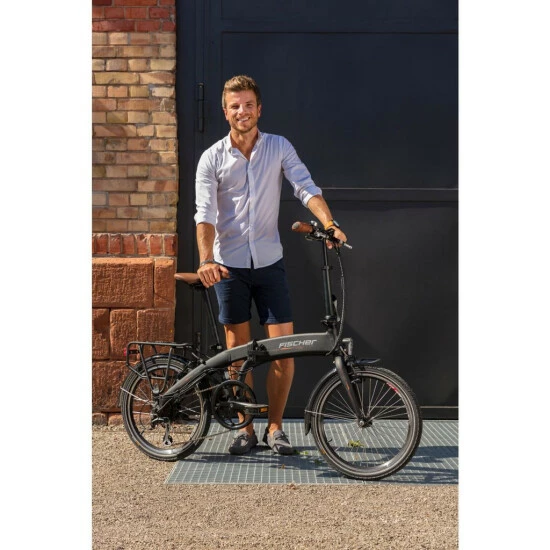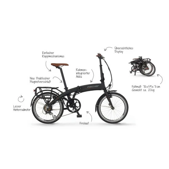 Wohnung oder ins Auto. Die dezente Optik ist ein weiteres Plus: Dank integriertem Akku und Hinterradmotor erkennt man erst auf den zweiten Blick, dass es ein Elektrorad ist. Mit Siebengang-Kettenschaltung, Licht und Gepäckträger ist das FISCHER-Faltrad komplett für den Alltag ausgestattet. Der neue Magnetverschluss ist besonders praktisch und erleichtert den Transport.