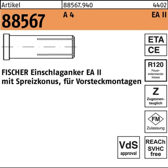 Artikel 88567 A 4 EA II FISCHER Einschlaganker EA II mit Spreizkonus · für Vorsteckmontagen – Abmessung: EA II M 8 x 30 VE=S (100 Stück) Weitere technische Eigenschaften: · Gruppencode: 88567.940 · Norm: REYHER-Artikel 88567 · Oberfläche: Ohne Oberflächenangabe