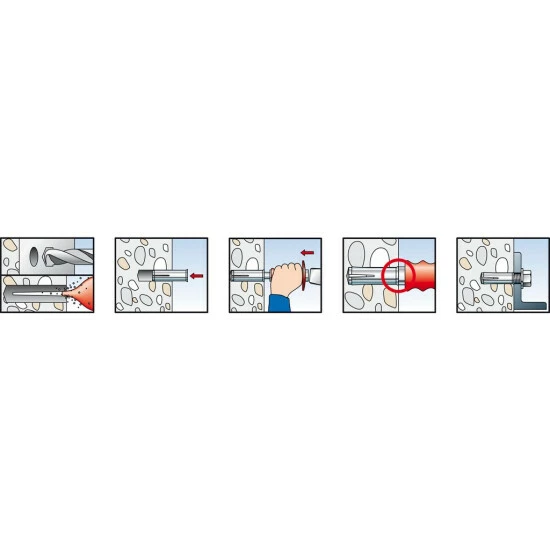 Danach wird mit dem Einschlagwerkzeug EAW H Plus (alternativ Maschinensetzgerät EA II-SDS) die Hülse durch das Eintreiben des innenliegenden Stifts aufgespreizt und gegen die Bohrlochwand verspannt.