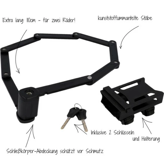 – Lieferumfang: Fahrrad-Falt-Schloss, 2 x Schlüssel, Kunststoffhalter