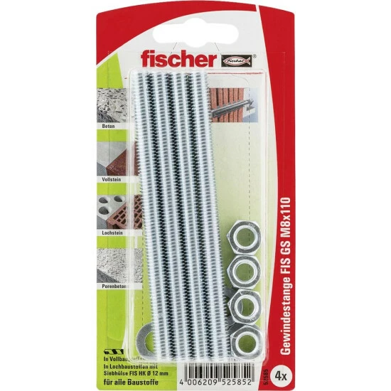Fischer FIS GS M 8×110 K – Gewindestangen für Injektionssystem FIS als 4er Set. Das Gewindestangenset beinhaltet ebenfalls je 4 Unterlegscheiben und 4 Muttern.
