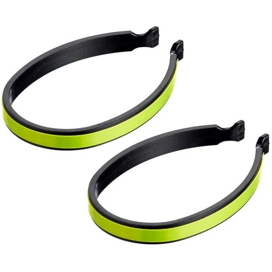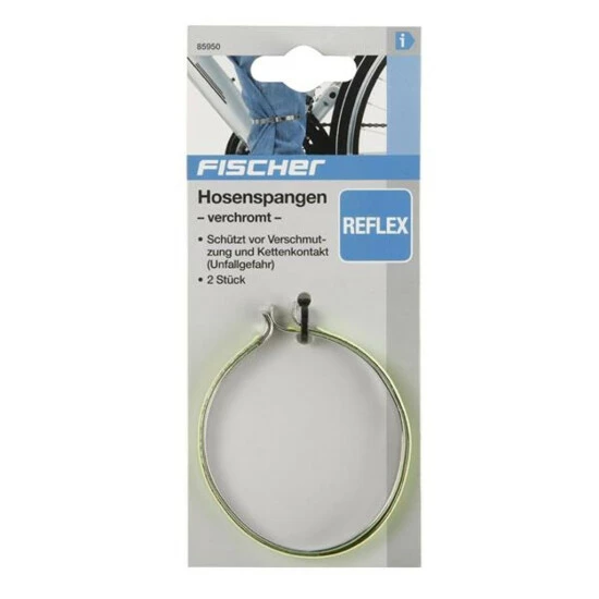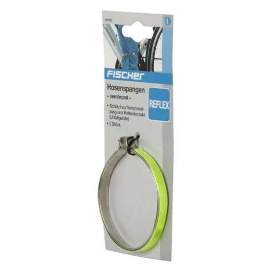 Die verchromten Hosenspangen schützen besonders effektiv vor Verschmutzung und Kettenkontakt. Zusätzlich sind sie mit einem reflektierenden Aufkleber für bessere Sichtbarkeit bei schlechten Sichtverhältnissen versehen. Der Lieferumfang enthält ein Paar Ho