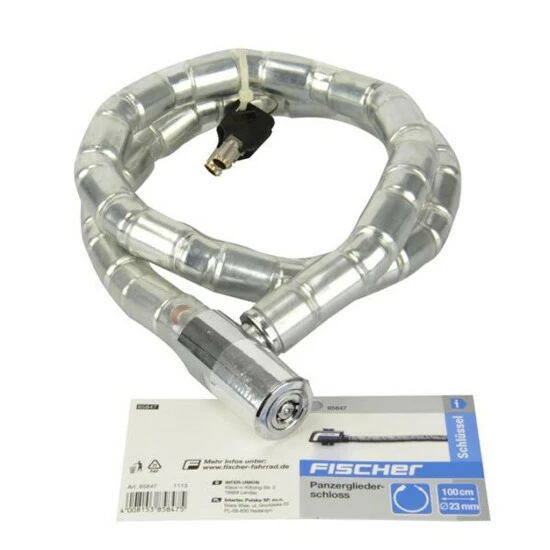 Wir machen es Fahrraddieben schwer! Mit dem richtigen Fahrrad-Schloss sichern Sie Ihr Rad vor Diebstahl. Und nicht nur Fahrraddieben das FISCHER Gliederschloss 100cm ist auf Grund seiner Länge auch hervorragend zur Sicherung eines Motorrades geeignet. Der Durchmesser beträgt 23mm. Zum Abschließen werden 2 Schlüssel mitgeliefert. das Schloss ist besonders sicher durch die doppelte Gelenkkapselung aus Spezialstahl.