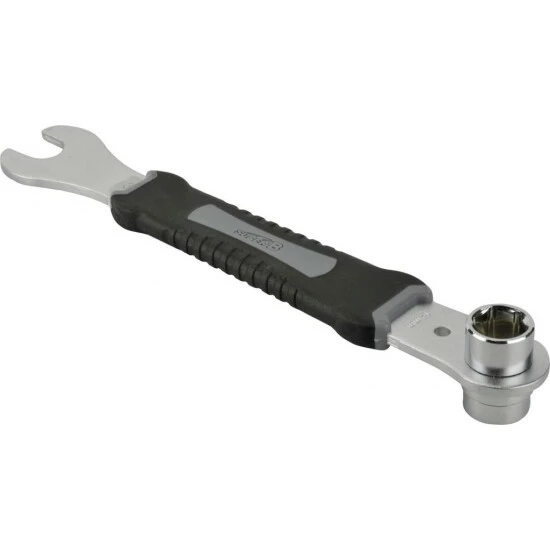 15 mm Maul und Nuss für die Montage am Pedal, 14 mm Nuss für Achsmutter14/15 mm