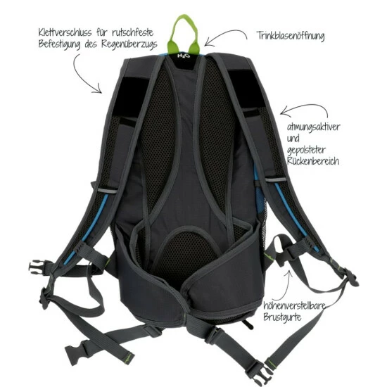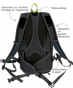 Das integrierte Regencover schützt den Rucksack bei Regen. In der Trinksystemhalterung ist genug Platz für einen Trinkbeutel und eine Schlauchdurchführung. So ist stets die Möglichkeit gegeben, auch während der Fahrt Wasser zu sich nehmen. Für optimalen Tragekomfort des Trinkrucksacks sorgen die komfortablen, atmungsaktiven und ergonomisch geformten Rückenpolster.