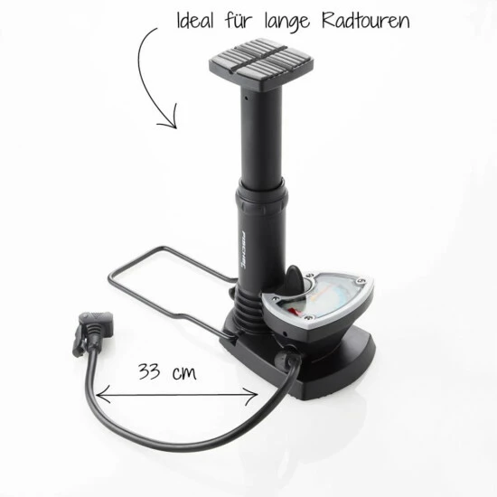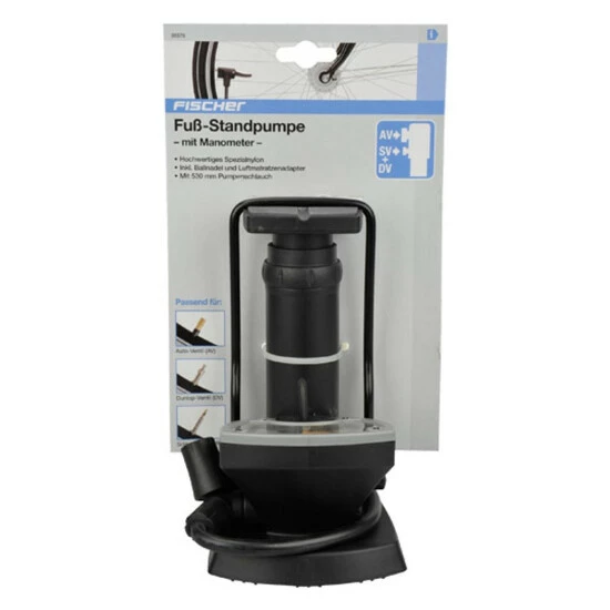 Die hochwertige FISCHER Standpumpe ist universal einsetzbar und mit einem Manometer ausgestattet. Mit dieser Standpumpe kann man einfach und mit geringem Kraftaufwand aufpumpen. Die Pumpe ist passend für: Auto-Ventil (AV), Dunlop-Ventil (DV), Sclaverand-Ventil (SV). Dank der im Lieferumfang enthaltenen Adpater können viele andere Aufblasartikel, wie Luftbetten, Luftmatratzen, Schwimmreifen etc. aufgepumpt werden.