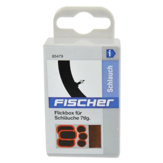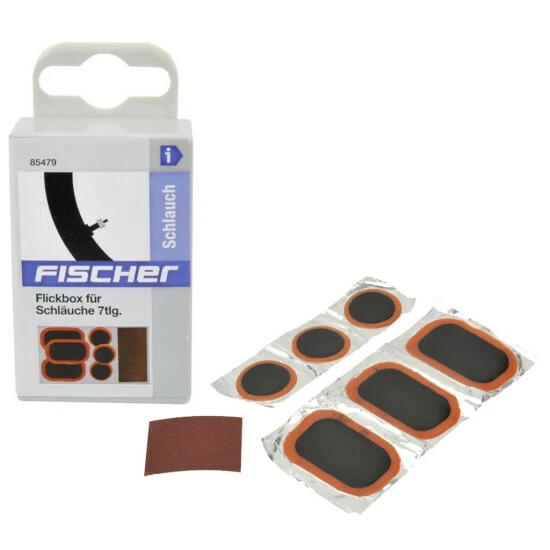 Flickbox für Schläuche von Fischer 7-teilig Set bestehend aus: 3 runde Flicken 3 ovale Flicken 1x Aufrauher