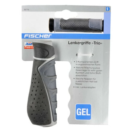 Die Lenkergriffe Trio von Fischer sind 3-Komponenten-Griffe mit einer ergonomischen Formgebung. Außerdem zeichnet sich die Verarbeitungstechnik durch ihre hohe Stoßabsorbtion aus. Zusätzlich erhöhen weiche Noppen den Halt, insbesondere bei Nässe. Zu den Lenkergriffen werden passende Lenkerstopfen geliefert.