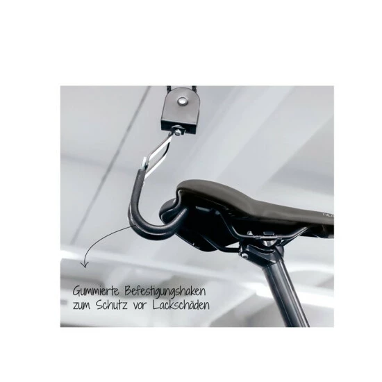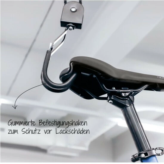 • SCHUTZ: Mit Gummi überzogene Befestigungshaken am Fahrradlift vermeiden Lackkratzer