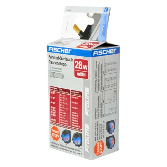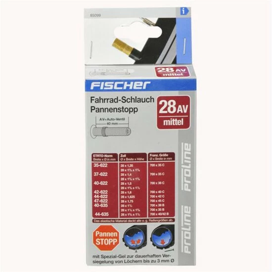 Fischer Pannen-Stopp Fahrrad-Schlauch mit Auto-Ventil Fahrradschlauch enthält ein Spezialgel zur dauerhaften Versiegelung von Löchern bis zu 300 mm Ø Technische Daten: ETRTO-Norm (Breite x Ø in mm): 35 bis 47 622 40 bis 44 635 Zoll: 28 x 1,75 bis 28 x 1 3/8 x 1 5/8 Franz. Größe: 700 x 35C bis 47C Schlauchtyp: mittel, pannenstopp Ventil: Auto 40 mm
