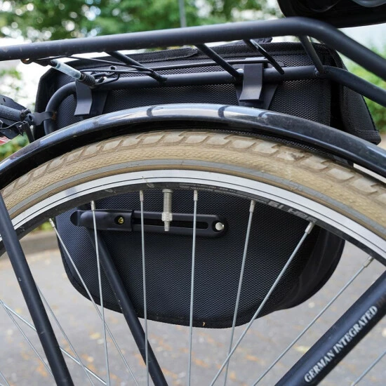 Die FISCHER Tasche für den Gepäckträger lässt sich durch Haken einfach befestigen und lösen.