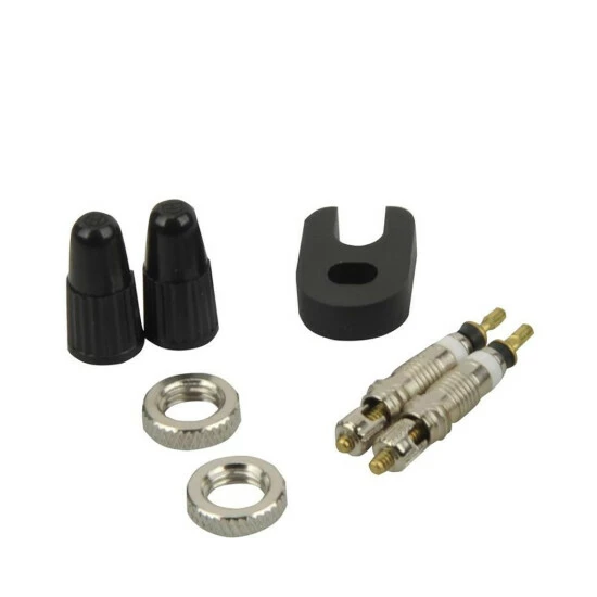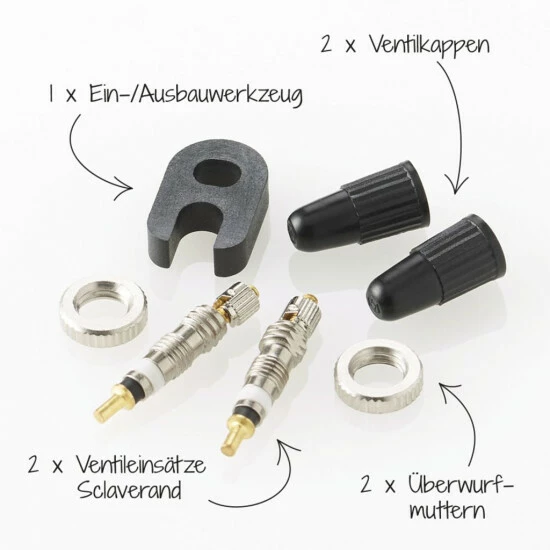 Das Set Sclaverand-Ventileinsätze gehört zur Grundausstattung eines Fahrradersatzteillagers. Es besteht aus zwei Ventileinsätzen, zwei Überwurfmuttern, zwei Ventilkappen und dazu passendem Ein-/Ausbauwerkzeug.