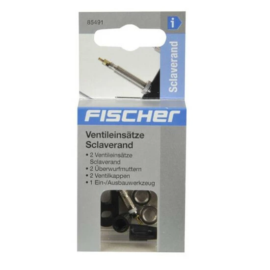 Fahrrad Ventil von Fischer Ventileinsätze Sclaverand 2 Ventileinsätze Sclaverand 2 Überwurfmuttern 2 Ventilkappen 1 Ein-/Ausbauwerkzeug Fischer Fahrrad Ventil / Ventileinsätze Sclaverand