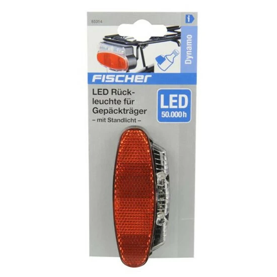 Dynamo LED Rückleuchte für Gepäckträger mit Standlicht LED Rückleuchte mit Standlicht für Gepäckträger von Fischer für dynamobetriebene Fahrradbeleuchtung für Gepäckträger LED Lebensdauer bis zu 50.000 Stunden Automatische Standlichtabschaltung bei Stillstand des Rades nach ca. 4 Min. Mit integriertem Z-Reflektor Schraubenabstand 80 mm 2 LED im Lichtstreifen (Klarglas, leuchtet rot) Nachfolgende Verkehrsteilnehmer können das Fahrrad mit dem Rücklicht mit Lichtstreifen besser und schneller einschätzen, da dieses ein räumliches Licht sendet StVZO zugelassen