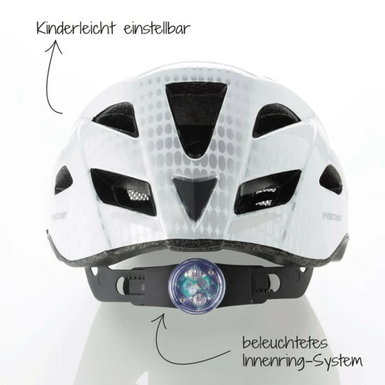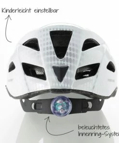 Wichtigstes Kriterium für eine Kaufentscheidung ist die passende Größe und die Möglichkeit zur flexiblen Anpassung des Fahrradhelms an die Kopfform. Die Größe kann über den beleuchteten Innenring verstellt werden. Die Batterien für die Beleuchtung des Fahrradhelms werden mitgeliefert. Zwanzig große Lufteinlässe mit Insektengitter ermöglichen den Luftdurchgang durch den Fahrradhelm, wodurch der Helm und so auch der Kopf kühl bleibt.
