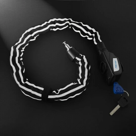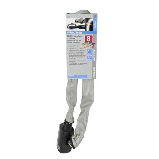 Das 80 cm lange Fahrrad-Kettenschloss von FISCHER ist von einem Textilschlauch ummantelt, der die Stahlkettenglieder umschließt und so das Rad vor Lackschäden bewahrt. Ein besonderes Merkmal des FISCHER Kettenschlosses ist die vollständige Hülle aus einem 3M Reflex-Material, was nicht nur schick aussieht, sondern auch bessere Sichtbarkeit in der Dunkelheit mit sich bringt. Das Fahrradschloss wird mit zwei Schlüsseln geliefert. Einer davon hat eine integrierte LED Leuchte, damit Sie im Dunklen problemlos das FISCHER Kettenschloss aufschließen können. Durch die integrierte Abdeckung gelangt kein Schmutz ins Fahrradschloss. Im Lieferumfang enthalten ist ein Klettband zur praktischen Befestigung.