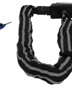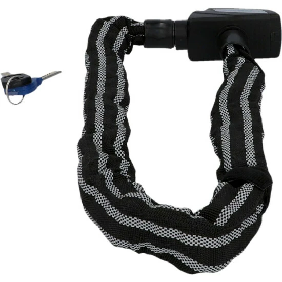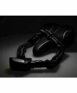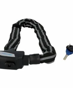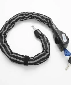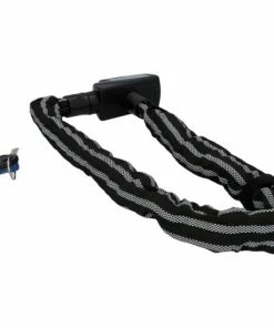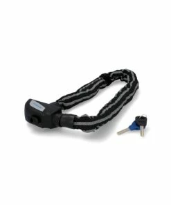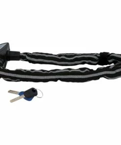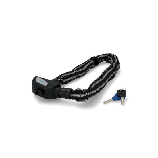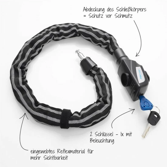 Das Kettenschloss ist komplett mit 3M Reflex Material ummantelt und besitzt eine Kettenlänge von ca. 80 cm bei einem Kettendurchmesser von ca. 8 mm. Es wird mit einem Schlüssel verschlossen und ist mit dem Security Level der Stufe 8 ausgezeichnet. Der Tex